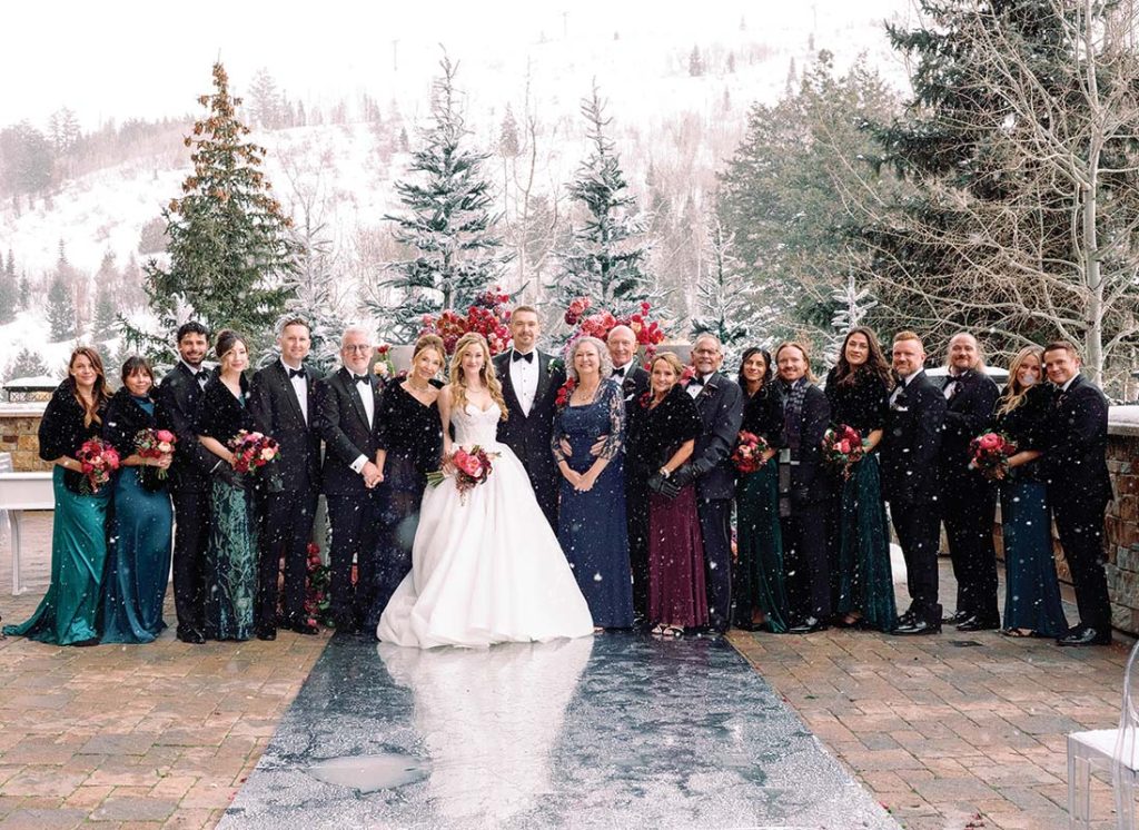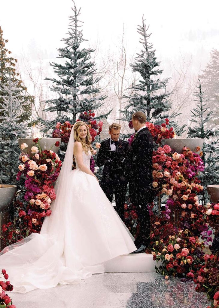St. Regis’ elegant atmosphere and ski-in ski-out access met the couple’s desire for adventure-meets-refinement during their wedding weekend. To take full advantage of Utah’s legendary winter scenery, an outdoor ceremony featured a mirrored aisle and berry-hued florals on all sides. As Rebecca floated down the aisle in a romantic ballgown by Leah de Gloria, soft snowflakes fell from the sky, marking the moment with winter magic. “Our guests even asked if we had paid to have the snow made,” Rachel laughs. “We hadn’t—it was pure magic.”
