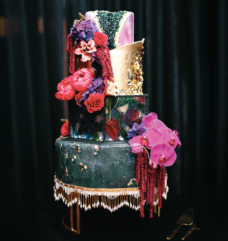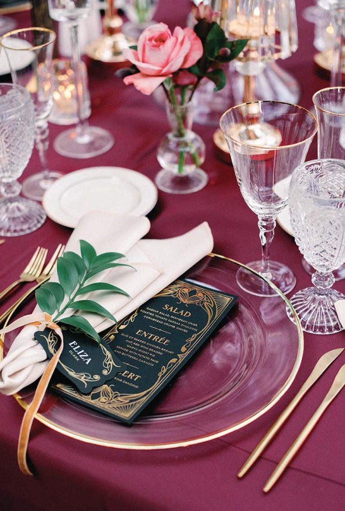 To up the ante, the reception area was embellished with Gatsby-level finery. Decadent gold and black made up the wedding palette, infused with pops of tropical green and pink to evoke a 1920s Havana speakeasy. As guests arrived, they were greeted by a “bouncer” dressed in full roaring ’20s attire who knocked on a secret bookshelf to open and reveal the lavish party within. Each detail told a story of secret indulgence; tarot-themed table assignments, flair bartending, casino tables and a Champagne wall. Once Rebecca changed into a flirty feathered party dress—The Charlie by Leah de Gloria—it was time to start the party. Live music kept revelers on their feet late into the evening, and the after party ensued in the sultry-lit Deer Crest Room. The following morning, wedding-goers enjoyed the ski haven by carving turns down Deer Valley’s award-winning terrain.