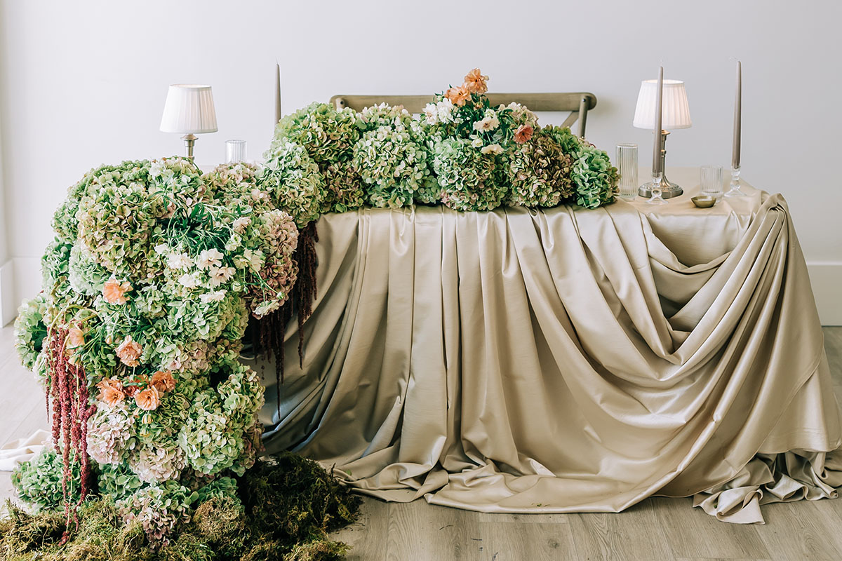 “Antique hydrangeas made up the bulk of the piece because they’re such a dependable workhorse,” says Reynolds. “They don’t wilt, they’re generous in volume, and full of moody, romantic tones. I paired them with light pink roses to bring softness and a refined edge to the design. The overall look is both structural and romantic, and it nods to the monochromatic, mono-bloom trends I’ve admired in other designers’ work, while still staying true to my style.”