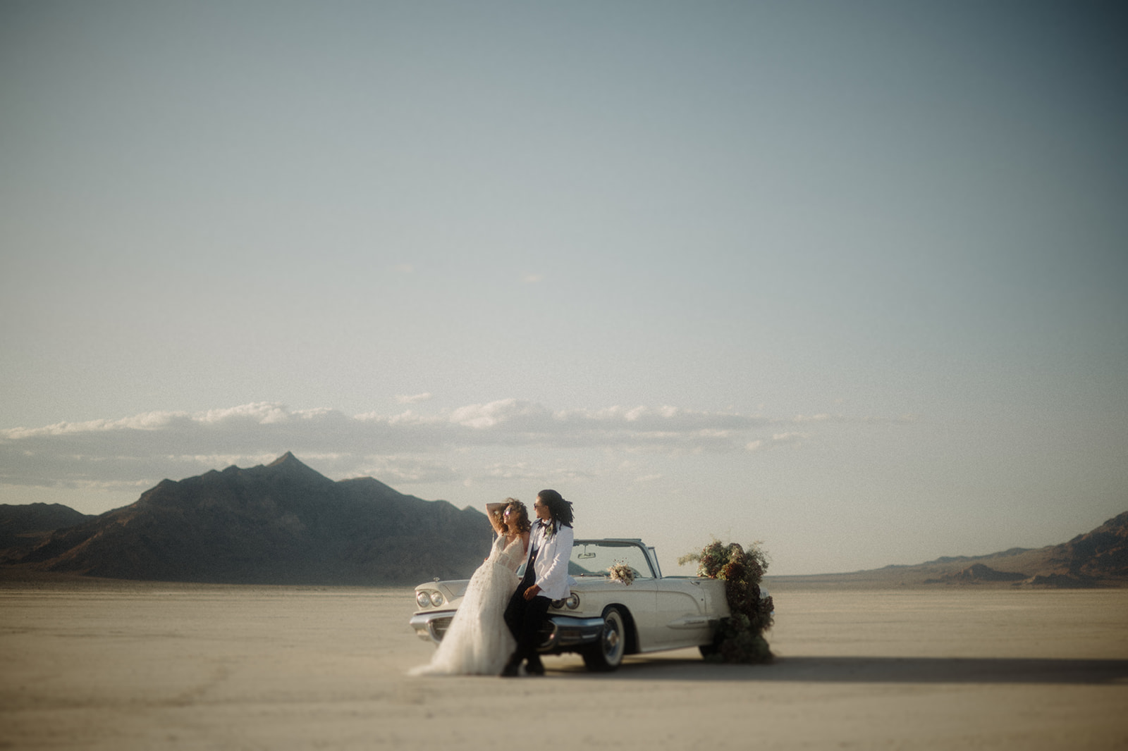 This shoot embraces neutral tones and relaxed movement. This easy-going approach allows for the couple’s love to shine. An old-time cruiser was provided to help the couple find relaxation in the shoot, giving the couple the opportunity to let go and explore. Set against the open landscape of the salt flats, the cruiser gives a rebellious edge ultimately providing the couple free reign of the space. Enjoying each other in the moment, the couple’s joy leads them to where they are going next. “Honestly, it’s proof that your elopement or session doesn’t have to be cookie-cutter. It can be adventurous, bold, and unapologetically you,” says Kelsey.