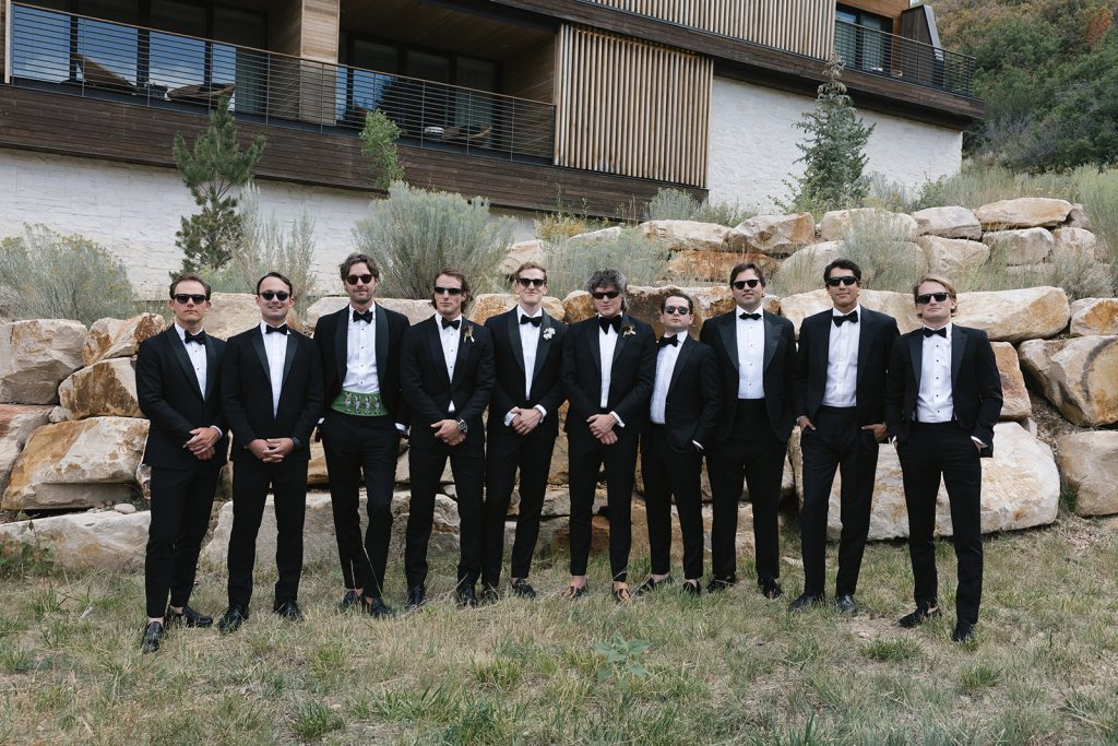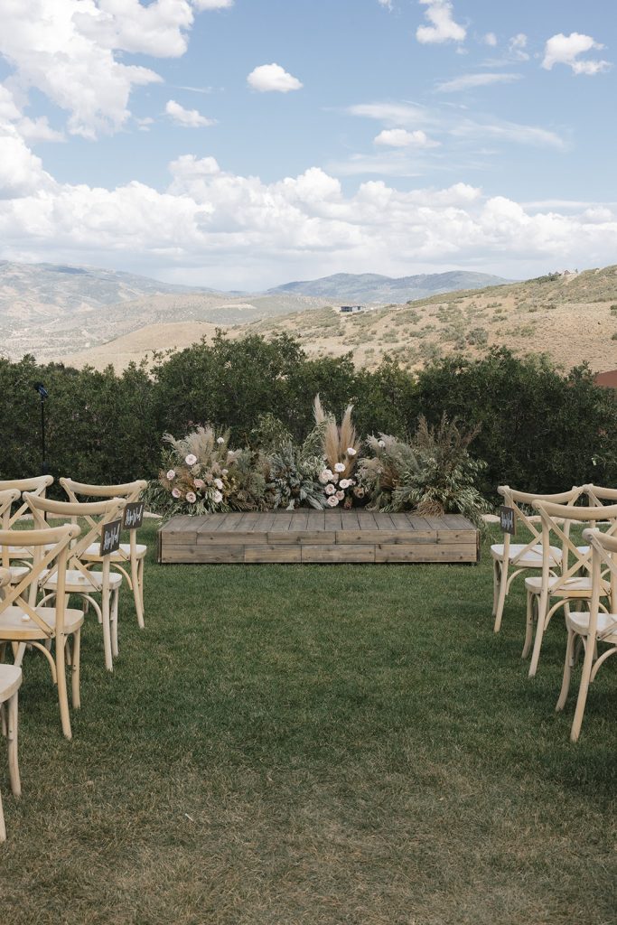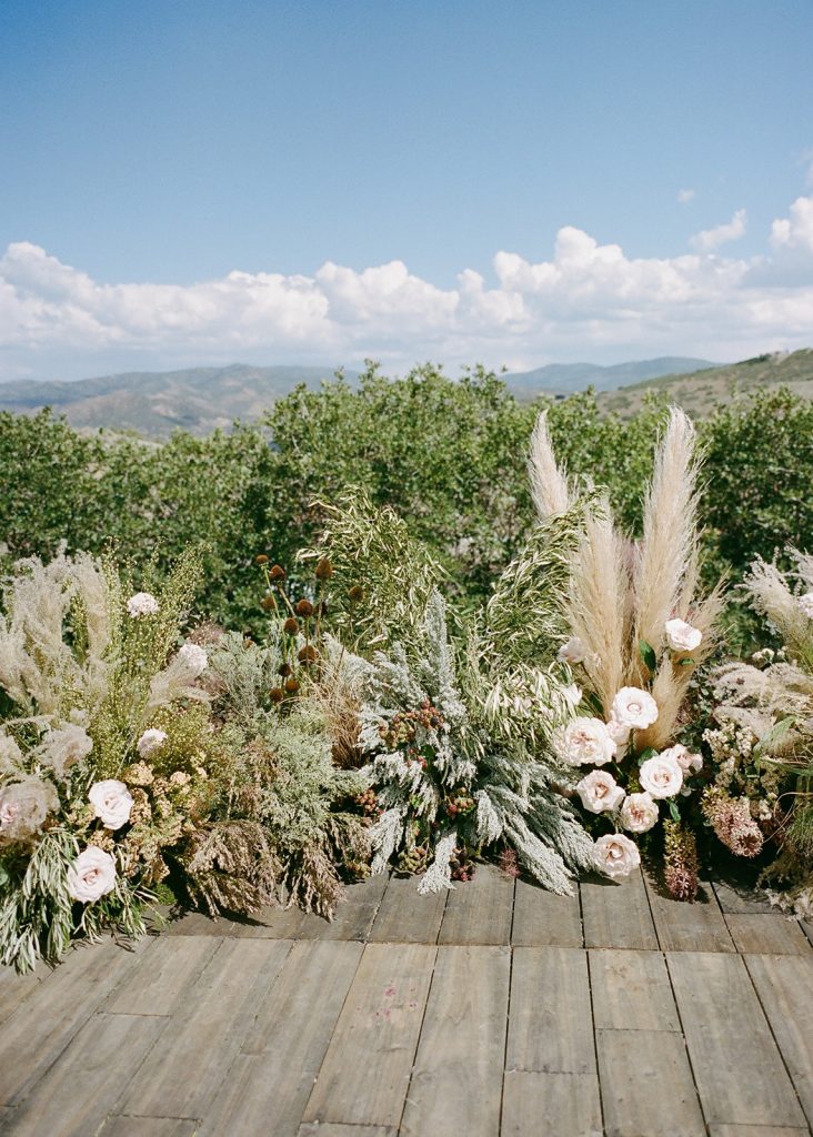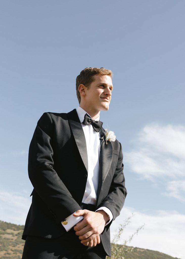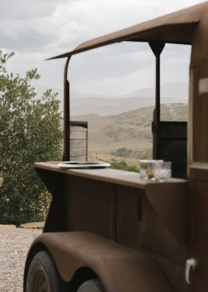 For the main event, their group convened at Blue Sky Lodge in Wanship. First up: a ceremony on the warm lawn, accented with neutral florals and dried foliage, perfectly blended into the mountain landscape. Enzo stood at attention in a classic black Hugo Boss suit, and watched as his bride-to-be floated down the aisle in a voluminous Danielle Frankel ballgown. Enzo’s brothers provided a reading and harmonica serenade during the ceremony itself, and the harmonica returned with an encore to provide ambiance alongside a guitarist during cocktail hour.