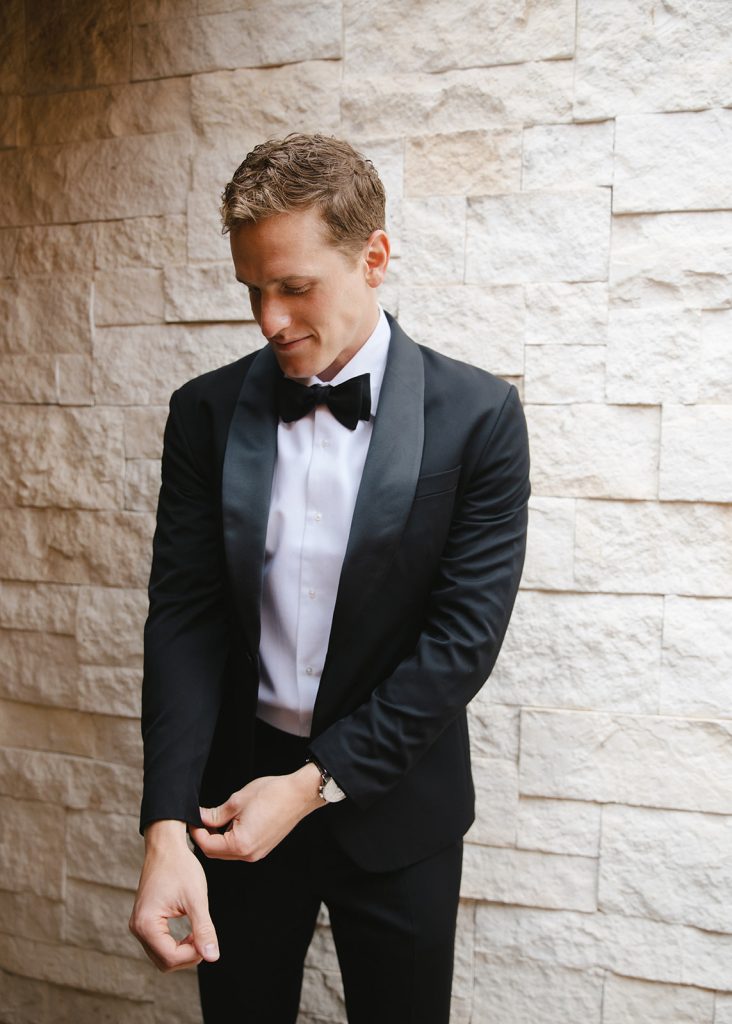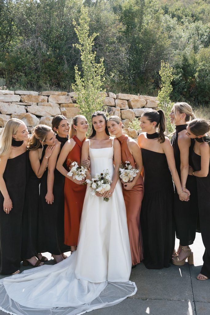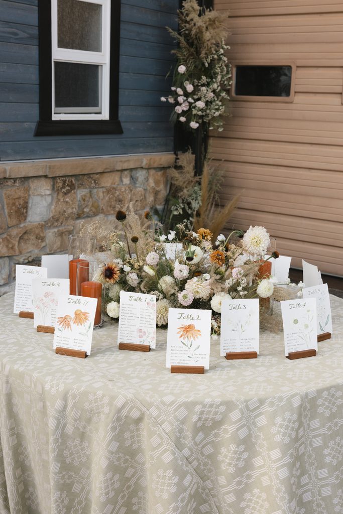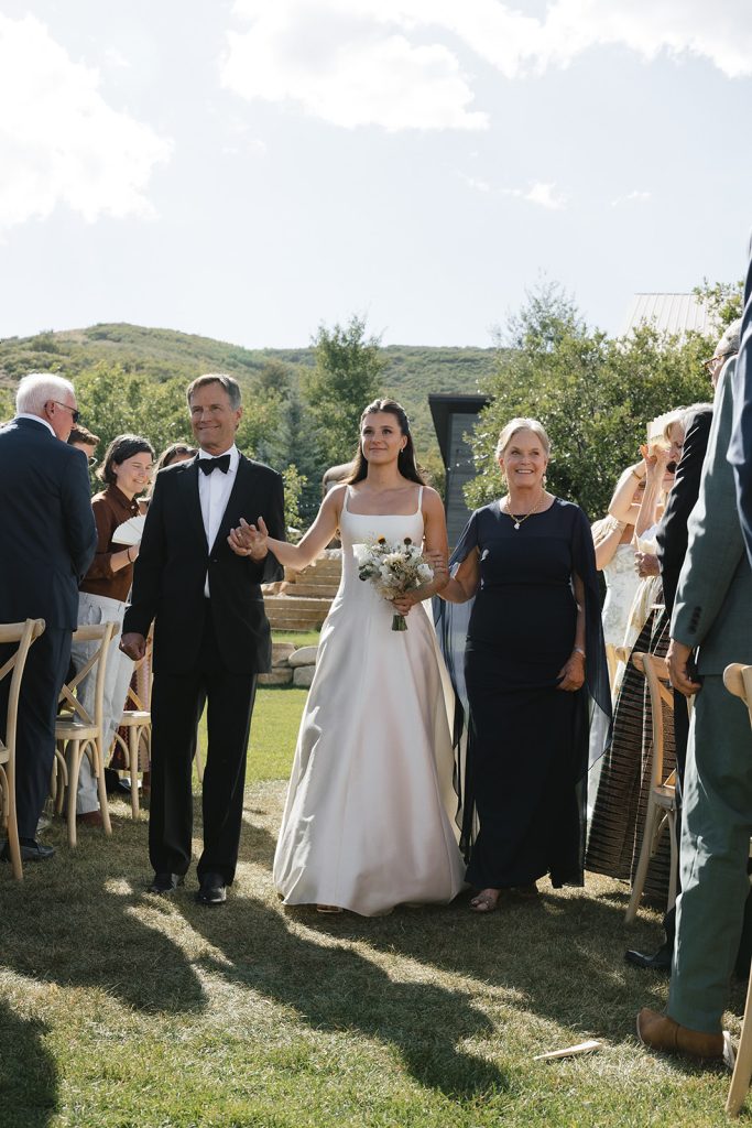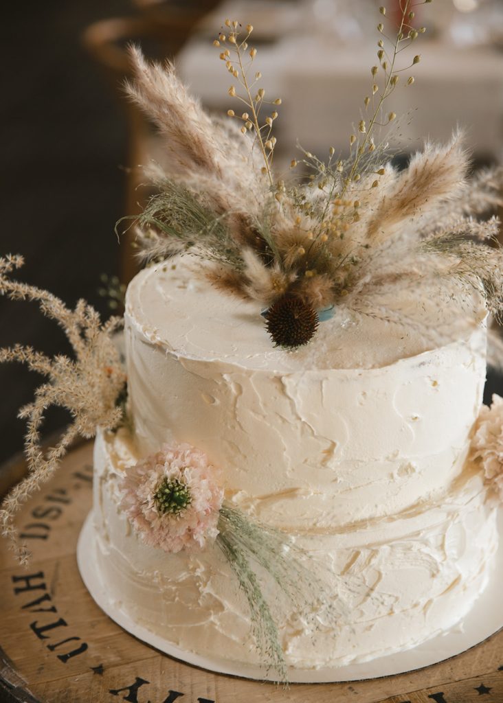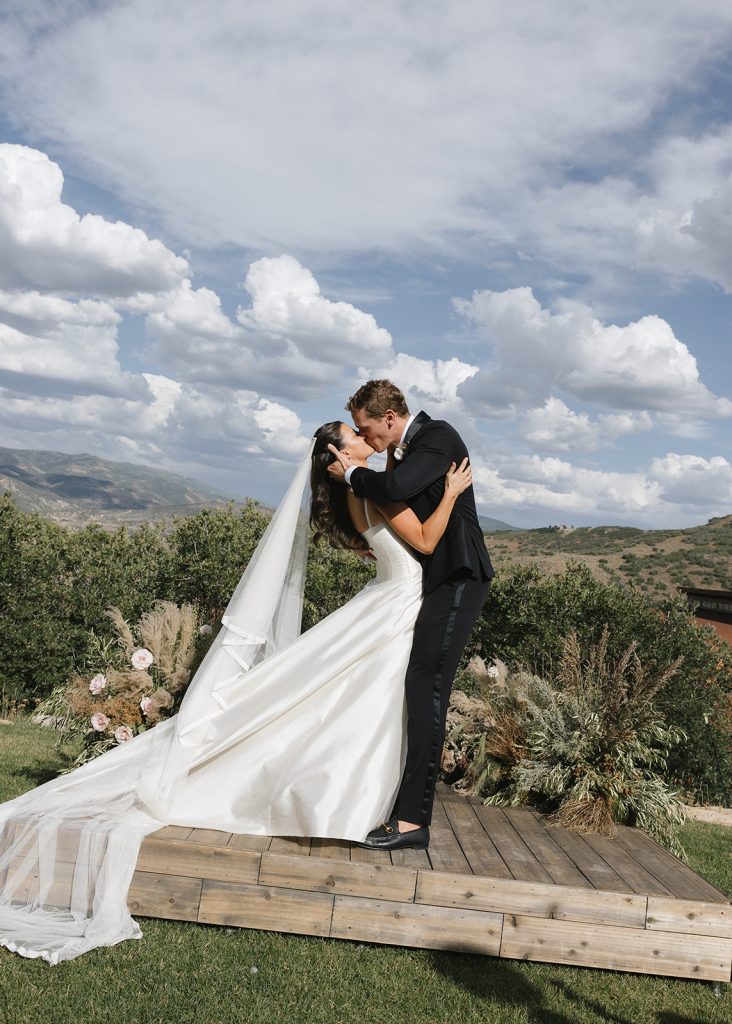 For the main event, their group convened at Blue Sky Lodge in Wanship. First up: a ceremony on the warm lawn, accented with neutral florals and dried foliage, perfectly blended into the mountain landscape. Enzo stood at attention in a classic black Hugo Boss suit, and watched as his bride-to-be floated down the aisle in a voluminous Danielle Frankel ballgown. Enzo’s brothers provided a reading and harmonica serenade during the ceremony itself, and the harmonica returned with an encore to provide ambiance alongside a guitarist during cocktail hour.