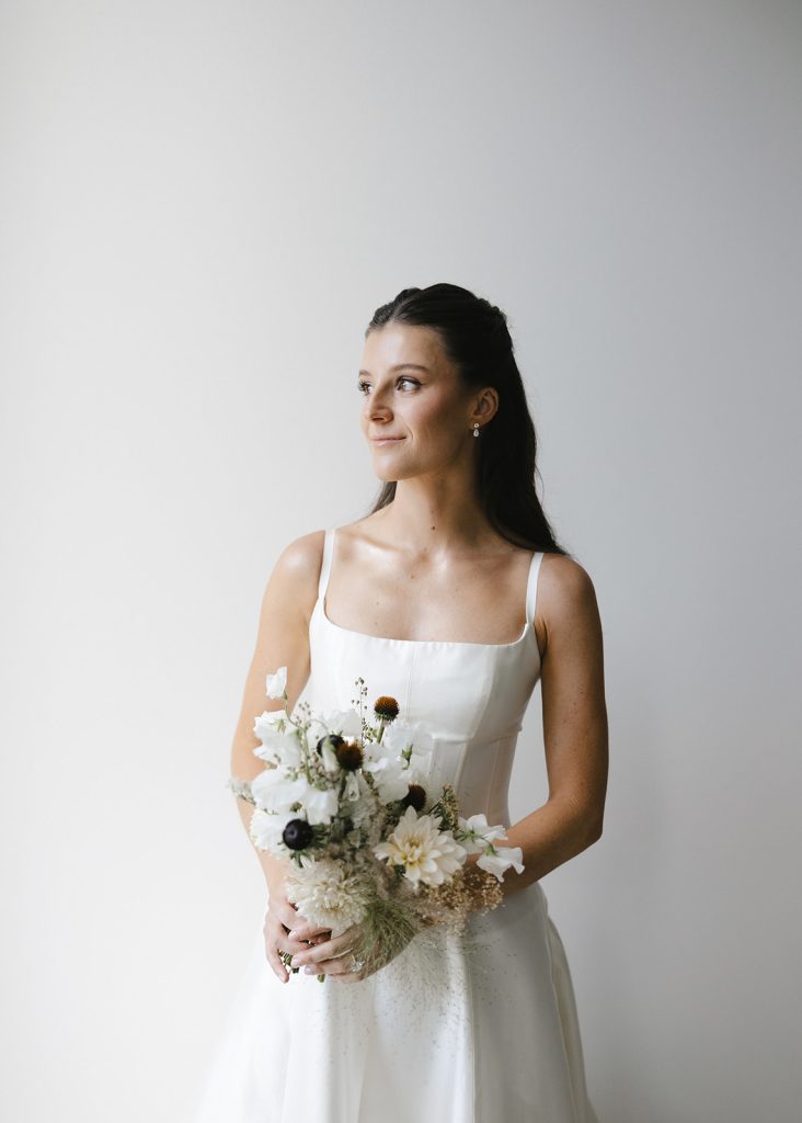 Gown #8, SEPT by Sarah Seven; O.C. Tanner Collection Round Eternity diamond band; O.C. Tanner Collection Estella diamond ring; Sethi Couture diamond eternity band; Sethi Couture Round diamond eternity band; Earrings via The Bridal Studio.