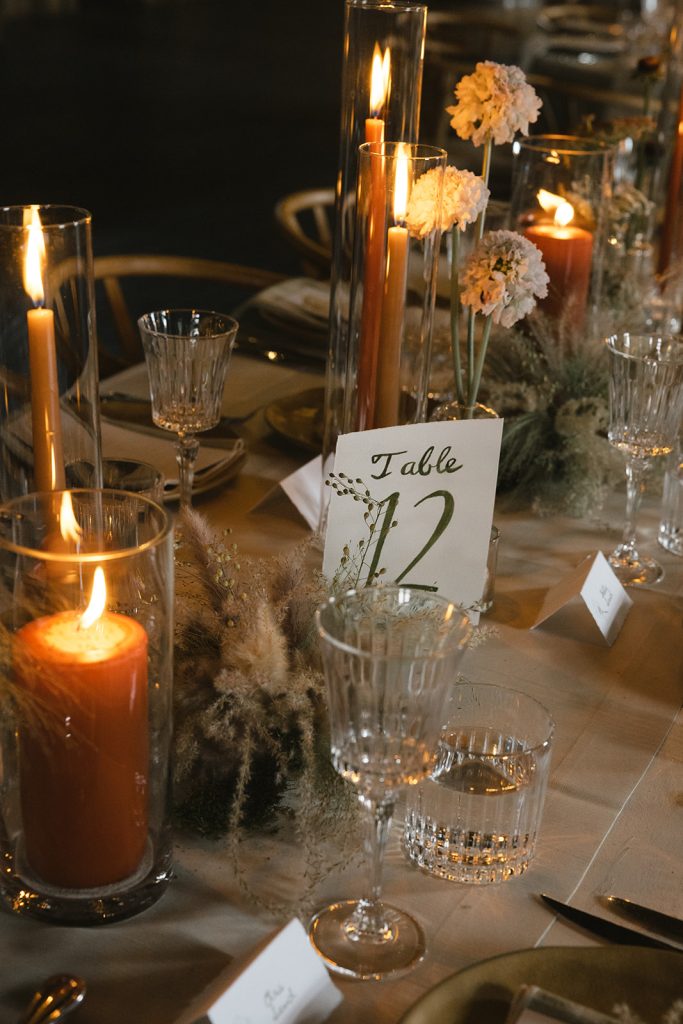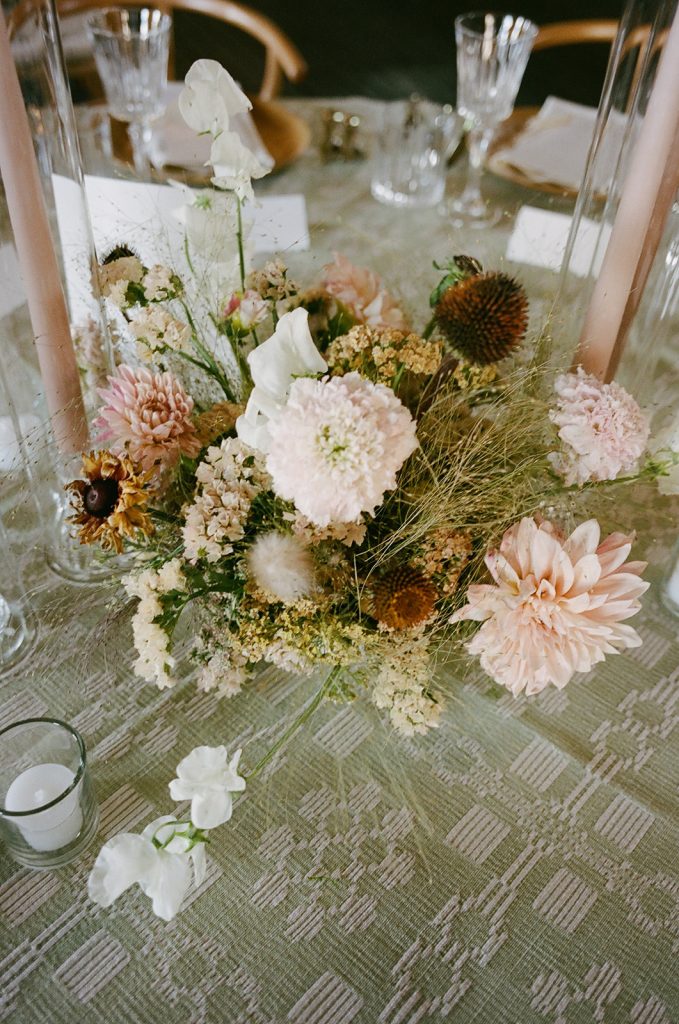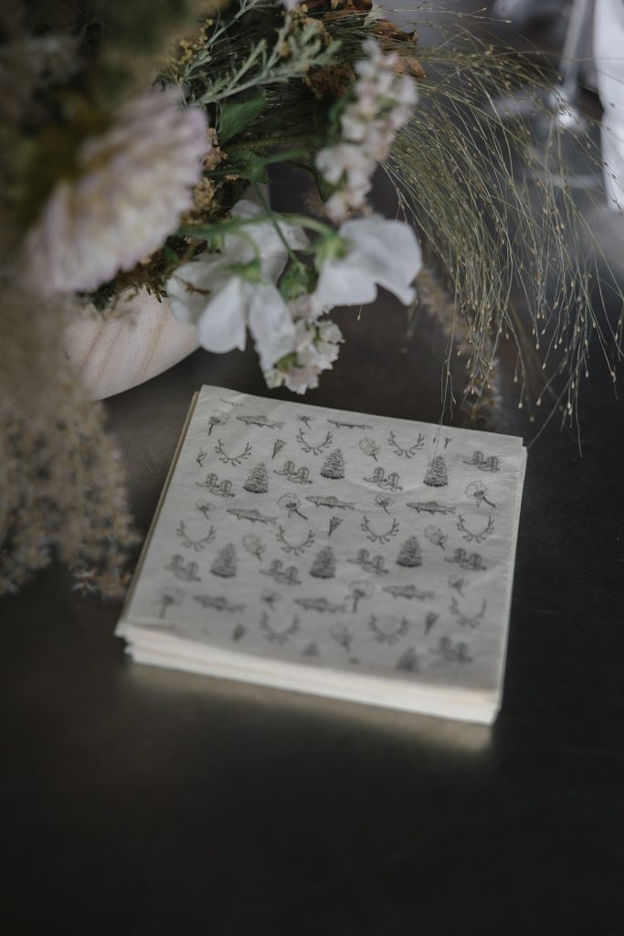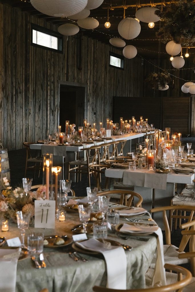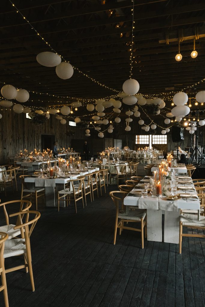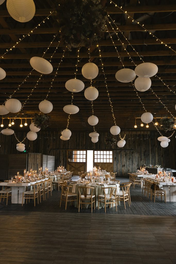 Amelia had a vision of rustic elegance for the ceremony celebration. Soft, organic florals, paper lanterns and twinkling lights across the ceiling set an elegant mood above carefully curated tables. Subtly patterned linens introduce a hint of Western flair among the glittering flatware, and sprigs of foraged ferns at every place setting invite each guest to recall the landscape just outside.