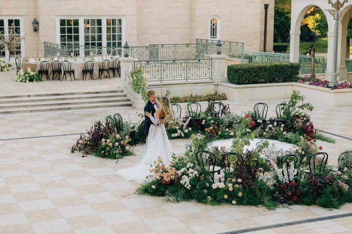 Rather than choosing a traditional altar setup, many couples are leaning toward a more interactive experience. In this magical scene set against the picturesque, European manor facade of the UVU MOA, guests are surrounded by a beautiful botanical garden as the couple exchanges vows in a circular ceremony arrangement that puts the lovers at center stage. Rich ruby and caramel florals radiate from the main event, immersing each guest in the day’s breathtaking scene.