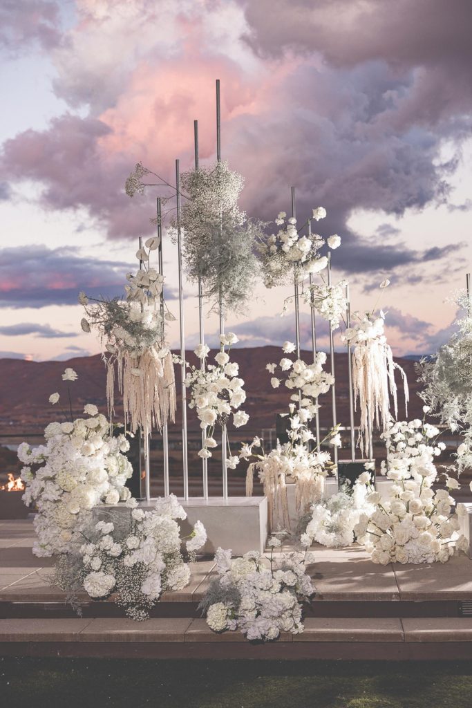 With a composition influenced by sharp lines and modern themes, McRae says it was up to Savage’s floral design to take the event from a high-end gala to a lush wedding. On the outdoor patio, delicately hung white hydrangea, Playa Blanca roses and bleached hanging amaranthus bring the ceremony space to life in the forefront of breathtaking valley-views. “The ceremony was meant to feel larger than life without interrupting the sweeping views of the Jordanelle Reservoir,” says Savage of Floral Rhapsody. “I wanted the florals to be visually engaging, with shapes and layers that guided your eye across the entire backdrop.”