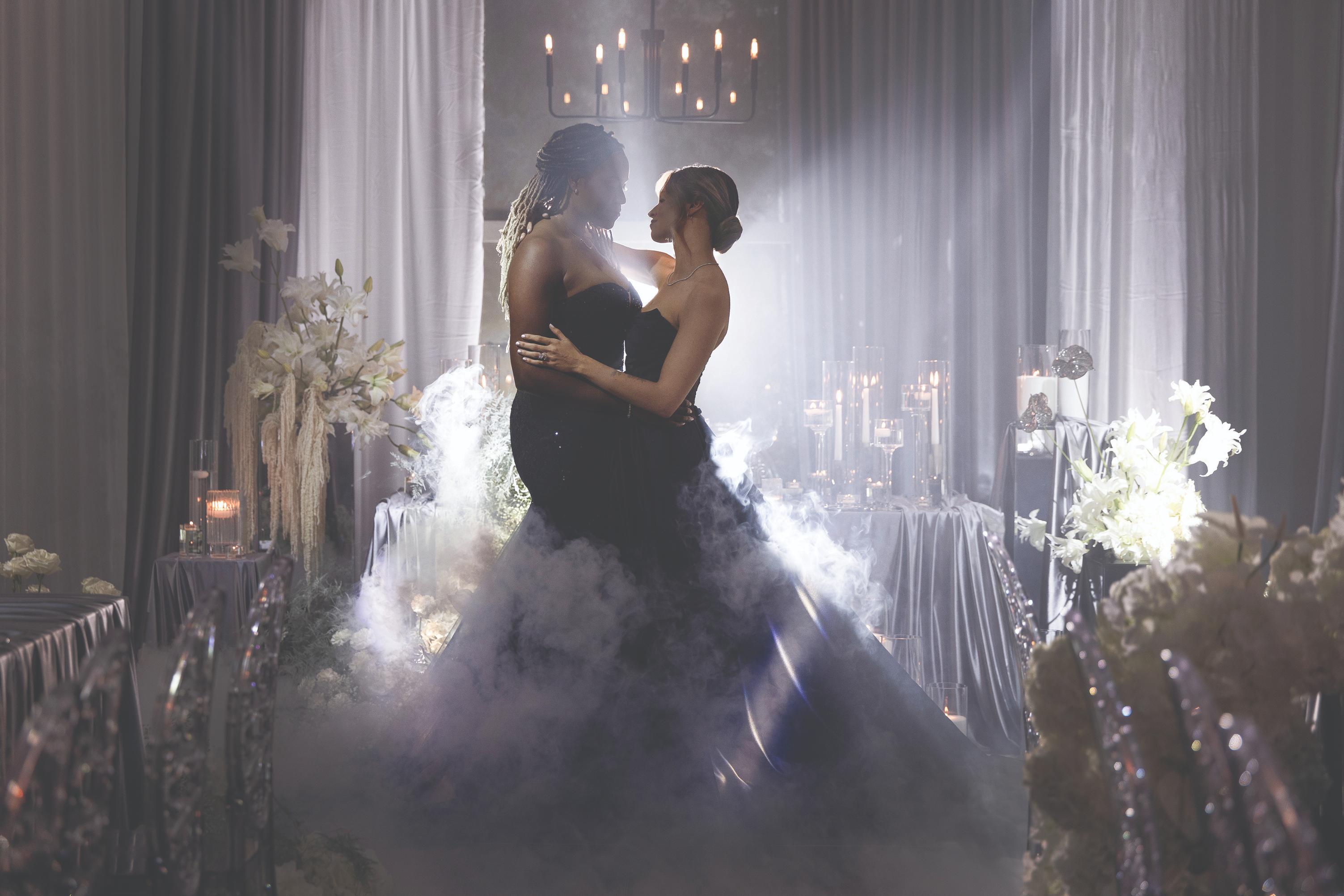 In a hidden speakeasy, two brides enjoy an intimate moment away from their guests. One bride wears a black satin a-line gown, the other a complementing mermaid cut with a plunging illusion neckline in the same color. Their dazzling ensembles create an arresting tableau against the backdrop of the bar.